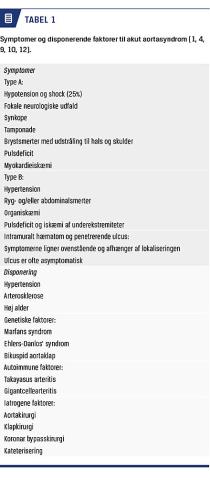 Der er flere forskelligartede disponerende faktorer til akut aortasyndrom (Tabel 1). Fælles for dem alle er en svækkelse af intima.