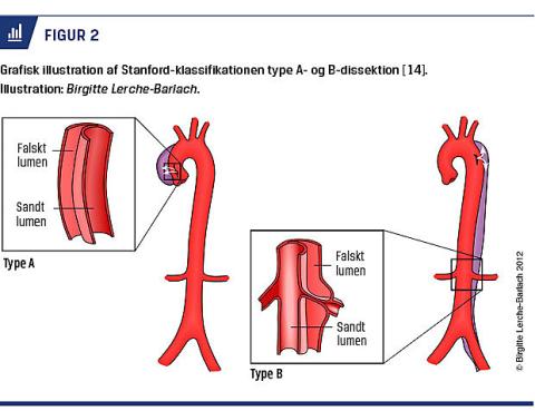 Klassisk aortadissektion, som er den hyppigste undergruppe af akut aortasyndrom [9], sker ved en brist i aortas intima, hvorved karvæggens lag spaltes fra hinanden, og to lumina opstår. Dissektionen kan involvere afgangen af visceralarterierne, med risiko for iskæmi af de organer, der forsynes fra aorta (nyrer, tarm og ben) til følge. Desuden kan der opstå hjertetamponade og ruptur af aorta [9]. Intramuralt hæmatom opstår ved ruptur i vasa vasorum i media og kan betragtes som