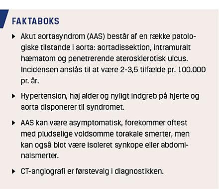 Formålet med denne artikel er at øge opmærksomheden på forekomsten af akut aortasyndrom og den kliniske præsentation samt at understrege, hvor vigtig optimal billeddiagnostik er i diagnosticeringen.