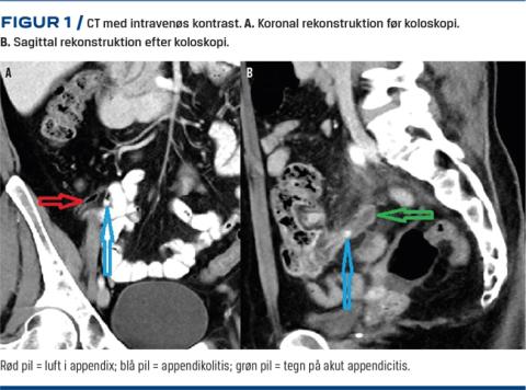 En 44-årig kvinde blev indlagt med mavesmerter, 24 timer efter at hun havde fået foretaget en ambulant koloskopi, som var et led i en klinisk kontrolundersøgelse fem uger efter en CT-verificeret akut sigmoiditis. Appendix var luftfyldt og reaktionsløs, og der blev påvist en appendikolitis distalt i lumen (Figur 1). Koloskopien blev gennemført uden komplikationer, og der blev påvist en stiv, ødematøs sigmoideum uden divertikler.