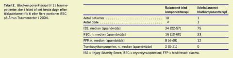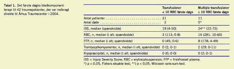 Resultater: I 2004 blev 565 patienter indbragt primært til Århus Traumecenter. 7% (42 patienter) fik transfusion af blodkomponenter i løbet af det første døgn. 2% (11 patienter) blev multitransfunderet, af disse døde 45% (fem patienter); en patient med meget svære læsioner (med maksimal Injury Severity Score) fik ikkebalanceret blodkomponentterapi: 33 portioner RBC og 12 portioner FFP uden trombocytkomponenter.