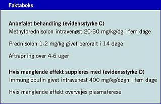 Der foreligger ingen randomiserede kontrollerede forsøg (RCT), hvori man sammenligner forskellige former for behandling, herunder behandling i forhold til ingen behandling. I en række større case- og kohortestudier har man påvist empirisk evidens for behandling med højdosis-methylprednisolon i.v. [4-6, 8, 9]. Immunglobulininfusion har alene (få tilfælde) eller i kombination med methylprednisolon i flere casestudier vist sig at være effektiv [8]. Plasmaferese har i enkelte caserapporter været effektiv i tilfælde, hvor methylprednisolon ikke har haft tilstrækkelig effekt [8].