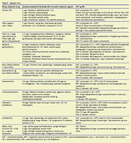 Elleve børn opfyldte studiets inklusionskriterier for ADEM dvs. akut eller subakut debut af multifokale symptomer og fund ved MR-skanning af cerebrum, der var forenelige med ADEM (Tabel 2) [1, 3-5]. Ved søgningen blev der desuden fundet MS hos to børn, Devics' syndrom/neuromyelitis optica hos et barn, fokal demyeliniserende læsion hos tre børn og arteritis cerebralis hos et barn.