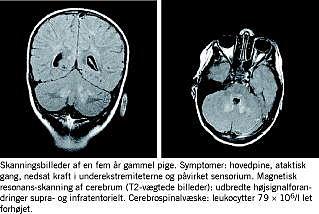 Summary Acute disseminated encephalomyelitis Ugeskr Læger 2008;170(21):1839-1842 Introduction: Acute disseminated encephalomyelitis (ADEM) is an autoimmune demyelinating disease of the central nervous system. It is difficult to distinguish between ADEM and multiple sclerosis (MS) and the treatment is much discussed. The purpose of this study was to evaluate the treatment and prognosis for children with ADEM and to evaluate the level of evidence in treatment. Materials and methods: Medical records were found by searching for diagnoses and reviewed retrospectively. The level of evidence in treatment was evaluated by searching PubMed, EMBASE and The Cochrane Library. Results: 11 children met the original inclusion criteria, acute or subacute onset of multifocal symptoms and MRI consistent with ADEM. The treatment was varied. Nine children had complete recovery. One child developed multiphasic disseminated encephalomyelitis or MS. One child developed epilepsy and cognitive deficits. There were no randomized controlled trials (RCT) but several larger case-series and cohort studies. Conclusions: The lack of controlled clinical trials may explain the varied treatment. In severe ADEM, intravenous high-dose corticosteroids are based on evidence grade C recommendation. In general, ADEM has a favorable prognosis. At initial presentation it is important to consider MS as a differential diagnosis.