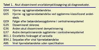 Akut dissemineret encefalomyelitis (ADEM) er en monofasisk autoimmun demyeliniserende sygdom i centralnervesystemet; den forudgås ofte af infektion eller vaccination [1]. Der findes ingen eksakte diagnostiske kriterier for ADEM, men der har i de senere år været konsensus om, at der i definitionen indgår kliniske og billedmæssige elementer [2-4]. Klinisk er tilstanden karakteriseret ved en akut eller subakut debut af multifokale neurologiske symptomer. Ved magnetisk resonans (MR)-skanning skal der ledsagende påvises fokale/multifokale demyeliniserende læsioner primært af hjernens hvide substans, og der må ikke være billedmæssige tegn på tidligere hvid substanssygdom [2-4]. Den subkortikale hvide substans og/eller den centrale grå substans (basalganglier og thalamus) er ofte afficeret, og medulla spinalis kan også være inddraget. Oftest ses lymfocytær pleocytose og let forhøjet proteinindhold i cerebrospinalvæsken [1, 3-5]. Sygdommen er sjælden, prævalensen er 0,4-0,8 pr. 100.000 [6]. Prognosen og afgrænsningen til især multipel sklerose (MS) er vigtig, men meget vanskelig [3, 7]. Den anvendte behandling har været varierende [8].