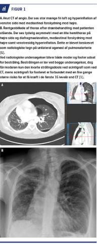 En 29-årig gravid kvinde blev indlagt akut med brystsmerter og åndenød. Hun havde pludseligt opstået trykken i venstre side af brystet med udstråling til venstre skulder og forværring ved inspiration. Hun havde astma og blev behandlet med terbutalininhalationer p.n. Ved indlæggelsen var iltsaturationen 92%, blodtrykket 104/56 mmHg og hjertefrekvensen 85 slag/min. En stetoskopi var normal uden bilyde og mislyde. Ekg var normofrekvent med inkomplet højresidigt grenblok.