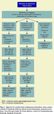 Summary Acute pharmacological treatment of depression Ugeskr Læger 2007;169(16):1436-1439 Depression is one of the most economically burdensome diseases with serious consequences for patients as well as their families. Many depressed patients are not treated because they neither contact a doctor nor are diagnosed correctly. Today, it is generally accepted that depression is not just one disease but is composed of subgroups, each requiring its own specific treatment. In mild to moderate depression SSRIs or other newer antidepressants can be used but in cases of severe melancholic or psychotic depression TCAs or ECT are the treatments of choice.