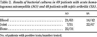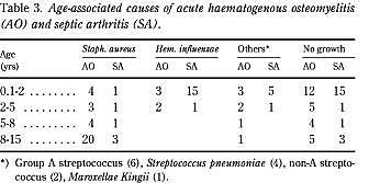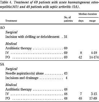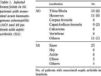 Summary Epidemiological, bacteriological, and long-term follow-up data of 69 children with acute haematogenous osteomyelitis and 48 children with septic arthritis. A 10-year review. Ugeskr Læger 2001; 163: 4177-81. Introduction: The proper treatment of patients with acute haematogenous osteomyelitis and acute suppurative arthritis is still controversial. Based on a previous study, a treatment regimen was recommended. We now report on the clinical, bacteriological, and radiological aspects of the diseases, with special attention to possible changes in the natural history of the diseases and the long-term prognosis. Material and methods: A total of 69 children with acute haematogenous osteomyelitis and 48 with septic arthritis admitted in the period 1977-1987 were entered in a retrospective review. Epidemiological and bacteriological data were analysed and compared to those of an earlier study (1965-1974), confined to the same geographical area. Long-term outcome was assessed by a questionnaire and clinical-radiographic follow-up. Results/conclusions: A significant increase in the admission rate for both disorders was seen. The long-term outcome was favourable, with major sequelae found in only three patients (3%) and minor sequelae in two patients (2%). The benign long-term outcome may well be related to quick admittance to hospitals and long-lasting, appropriate antibiotic treatment.