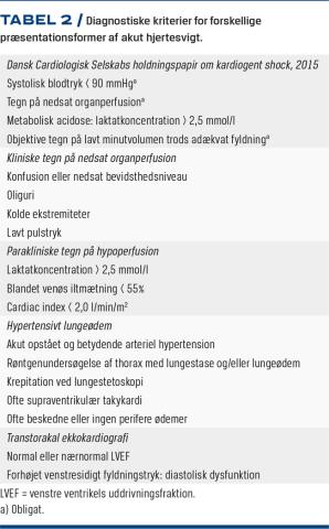 Kardiogent shock er en sjælden form for AHF og har den dårligste prognose med en etårsmortalitet på 40-50% [6, 16]. Diagnosen stilles klinisk ved tegn på kompromitteret organperfusion pga. primær kardial dysfunktion [17]. Der findes ikke en universel definition, men i tilstanden indgår ofte hypotension, kliniske tegn på nedsat organperfusion, stigende laktatniveau og lavt minutvolumen trods adækvate fyldningstryk (Tabel 2). Diagnosen kan således ikke stilles uden et objektivt mål for nedsat minutvolumen med adækvat fyldning, som i praksis vil blive undersøgt med ekkokardiografi. Patienten har ofte backward failure med øget tryk i venstre atrium og lungekredsløb med lungestase til følge. Patienten er derfor oftest våd og kold [11]. Den hyppigste årsag er akut myokardieinfarkt (AMI), og af patienter, hvor man havde mistanke om ST-elevations-myokardieinfarkt, på to tertiære hjertecentre (Rigshospitalet og Odense Universitetshospital) opfyldte 10% kriterierne for kardiogent shock [18]. Mekaniske komplikationer bør altid overvejes: myokardieruptur i form af frivægsruptur, ventrikelseptumdefekt eller papillærmuskelruptur. Frivægsruptur medfører ofte livstruende perikardietamponade eller død [19]. Papillærmuskel- eller chordaruptur medfører akut mitralinsufficiens og lungeødem. Svær insufficiens af aortaklappen kan ses akut ved infektiøs endokarditis og aortadissektion. Myokarditis og kardiomyopatier er sjældne årsager til kardiogent shock.
