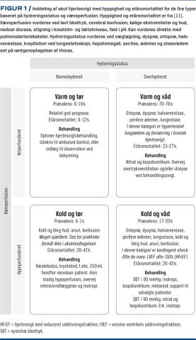 Det kan være gavnligt at underinddele patienter med AHF efter deres initiale kliniske tilstand. Der er foreslået adskillige inddelingssystemer [1], men i praksis afhænger den initiale behandling i høj grad af hydreringsstatus (våd/tør) og organperfusion (varm/kold) [5, 11]. En inddeling med udgangspunkt i disse parametre har vist sig at være klinisk anvendelig [5]. Den bruges i internationale guidelines [1] og gør det muligt at målrette behandlingen til den enkelte patient (Figur 1). Desværre har inddelingen også sine begrænsninger; våd (oversat fra det engelske congestion) henviser til tilstande med forhøjet kardielt fyldningstryk, som medfører stase og væskeophobning i bagvedliggende organer (inkompensation). Patienten med lungeødem er våd pga. lokal væskeophobning i lungerne og er ikke nødvendigvis systemisk overhydreret.