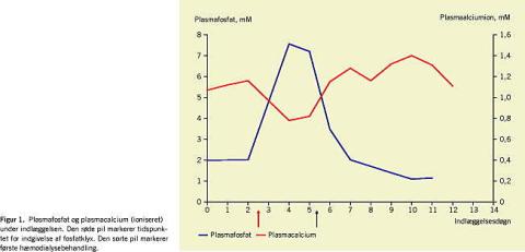 Imidlertid viste blodprøver taget dagen efter krampeanfaldet et P-fosfat på 7,56 mmol/l og P-calcium på 0,78 mmol/l (Figur 1). Patienten blev i de følgende dage behandlet med intensiveret hæmodialyse (fire timer dagligt) samt intravenøst og peroralt calciumtilskud. Herved normaliseredes calcium- og fosfatkoncentrationerne i løbet af en uge.