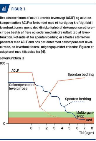 Det kliniske forløb er illustreret i Figur 1. Det synes at være graden af ACLF og ikke selve den udløsende årsag, som er bestemmende for det klinisk forløb og prognosen. Der er udviklet en algoritme, CLIF-C-ACLF-