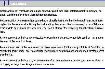 Gennem de senere år har der været stigende interesse for en mere aktiv og mindre invasiv behandling af iliofemoral DVT med henblik på at reducere forekomsten af PTS. I flere internationale studier er der påvist en positiv effekt af kateterbaseret trombolyse ved iliofemoral DVT [7-10]. Denne statusartikel omhandler det relativt nye behandlingsprincip med kateterbaseret trombolyse, som siden 1990'erne har været betragtet som en ny og lovende behandling af iliofemoral DVT. Metoden blev første gang anvendt i Danmark i 1999 og er siden udført på Karkirurgisk Afdeling, Gentofte Hospital i tæt samarbejde med Billeddiagnostisk Afdeling, Gentofte Hospital og Trombosecentret.