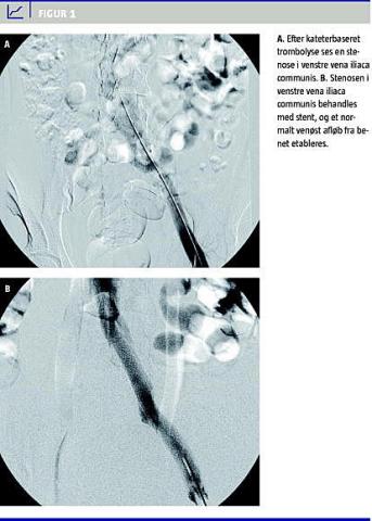 Iliofemoral dyb venøs trombose (DVT) rammer patienter i alle aldersgrupper og ses blandt andet hos unge kvinder efter påbegyndelse af p-pille-behandling, ved graviditet og puerperium samt efter traumer og kirurgi. Det posttrombotiske syndrom (PTS) er en hyppig følgetilstand til DVT, især efter DVT i det iliofemorale segment [1]. I flere studier har man påvist en forekomst af PTS på 40-50% på trods af antikoagulans (AK)-behandling [2, 3]; specielt okklusion af det iliofemorale segment kombineret med klapinsufficiens øger risikoen for udvikling af PTS og især for hudforandringer [4]. Den tidligere antagelse var, at PTS udviklede sig 5-10 år efter den akutte trombose, men nyere studier har vist, at PTS hos størstedelen kan konstateres allerede inden for 1-2 år efter den akutte DVT [2, 3]. PTS er karakteriseret ved smerter i den afficerede ekstremitet, hævelse, eksem og i de svære tilfælde ved forekomst af venøst ulcus. Ved persisterende okklusive forandringer i bækkenvenen ses venøs claudicatio som en del af PTS [4]. Brug af graduerede kompressionsstrømper har i kontrollerede studier vist sig at kunne reducere forekomsten af PTS med op mod 50% [2, 5]. PTS er forbundet med store sociale, samfundsmæssige og økonomiske konsekvenser.