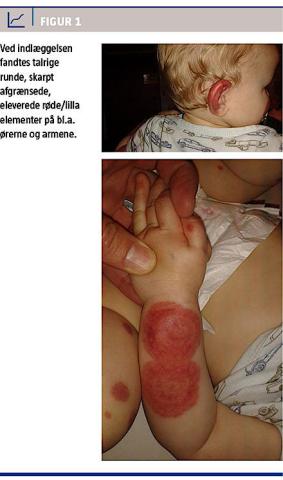 infektion. Ved indlæggelsen fandtes talrige runde, skarpt afgrænsede eleverede rød/lilla elementer på huden, symmetrisk i ansigtet, på armene (Figur 1), i bleområdet samt på underbenene og fødderne. Flertallet af de hæmoragiske elementer havde kokardetegning. Det ene øre var rødt og hævet, og fødderne så hævede og ømme, at han ikke ville støtte på dem. Huden på truncus var normal. Han var i øvrigt afebril og upåvirket. Paraklinisk fandtes et C-reaktivt protein (CRP)-niveau på 65,8 mg/l og et leukocytniveau inden for normalområdet.