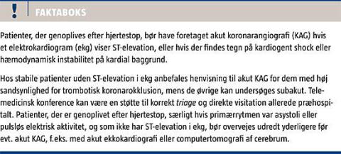 De fleste dødsfald blandt indlagte patienter, der er genoplivet efter hjertestop, skyldes sequelae efter cerebral hypoksi, og terapifokus skal helt initialt rettes mod denne alvorlige risiko. Behandlingsstrategien skal samtidig målrettes mod udredning og behandling af eventuel underliggende årsag til hjertestop. Akut KAG efter overlevet hjertestop er en rationel og potentielt livreddende behandling hos patienter med ST-elevation i ekg og hos patienter med kardiogent shock, ikke mindst hvis primærrytmen var ventrikelflimren. Ved ikkestødbar primærrytme og/eller fravær af ST-elevationer i ekg vil sandsynligheden for signifikante koronarstenoser og særligt trombotiske okklusioner være betydeligt mindre, og andre årsager til hjertestop, herunder cerebral katastrofe eller lungeemboli, vil være hyppigere. Til patienter med hjertestop uden ST-elevation anbefales en individualiseret visitation med telemedicinsk konference med et specialiseret center efter initial præhospital behandling.