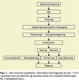 Som led i udarbejdelse af forløbspakker har Dansk Selskab for Patologisk Anatomi og Cytologi udarbejdet en model, hvor man tilstræber at stille en diagnose på små vævsprøver inden for tre arbejdsdage. I øjeblikket omfatter forløbspakkerne kun fire kræftsygdomme, men når alle kræftformer skal med i løbet af 2008, vil det sætte patologiafdelingerne under et voldsomt pres. Diagnosen kræft hviler i næsten alle tilfælde på en mikroskopisk undersøgelse af celle- eller vævsprøver, og det er afgørende for patientens behandling, at den histologiske type, differentiering og udbredelse bestemmes. Typebestemmelse kræver ofte immunhistokemisk farvning, og hvis patienten skal indgå i de nye målrettede behandlingsregimener, er molekylærbiologisk undersøgelse af vævet nødvendig. Processen, fra en vævsprøve modtages på patologiafdelingen, til en diagnose kan afgives, består af en lang række trin, som samlet tager 3-7 arbejdsdage (Figur 1 ). En række nye teknikker vil dog kunne medvirke til at afkorte processen.