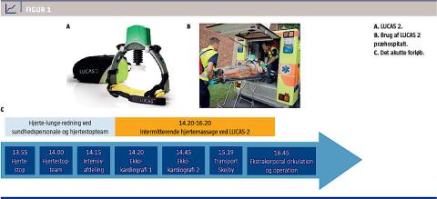 Pulsløs elektrisk aktivitet (PEA), som ofte ses hos patienter med fulminant lungeemboli, er den primære rytme i hovedparten af tilfældene med hjertestop på et hospital [1, 2]. Specielt hos disse patienter er kontinuerlig og effektiv hjertemassage afgørende for prognose og overlevelse. I denne sygehistorie illustreres værdien af automatisk mekanisk hjertemassage, udført vha. Lund University Cardiac Arrest System (LUCAS 2), hos en patient, der fik hjertestop som led i akut lungeemboli (Figur 1).