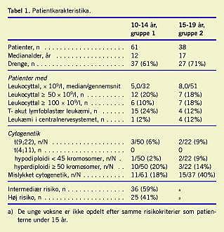 Materiale og metoder: Relevante kliniske data for børn mellem 10 år og 14 år blev fundet via den nordiske børne-ALL-database, mens data for de unge voksne blev fundet ved en retrospektiv journalgennemgang. I perioden diagnosticeredes 99 børn og unge mellem 10 år og 19 år med ALL; 61 børn blev behandlet efter den samme nordiske børne-ALL-protokol; 38 unge voksne blev behandlet efter forskellige voksen-ALL-protokoller. Data er opgjort pr. 1. januar 2005.