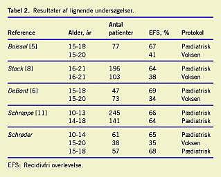 I fire opgørelser over resultaterne af ALL-behandling hos unge voksne er det påvist, at patienter, der blev behandlet efter pædiatriske ALL-protokoller, havde en signifikant bedre prognose end en gruppe unge voksne, der blev behandlet efter voksen-ALL-protokoller til trods for, at der ikke var forskel i forekomsten af såkaldte højrisikokriterier i de to grupper [5-8]. På basis heraf er det foreslået, at unge voksne kunne have gavn af at blive behandlet efter pædiatriske ALL-protokoller.
