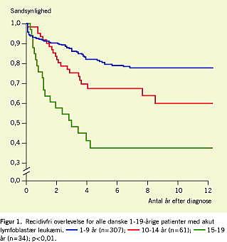 Ved sammenligning med denne gruppe blev det fundet, at den recidivfri overlevelse var signifikant højere hos de 15-18-årige, der var behandlet med børne-ALL-protokoller, end hos unge danske, der var behandlet efter voksenprotokoller (0,68 vs. 0,38, p < 0,01), mens der ikke var forskel på resultaterne mellem børn på 10-14 år og unge på 15-18 år, der blev behandlet efter de samme protokoller (upublicerede data fra det nordiske ALL-register) (0,68 vs. 0,60, p = 0,7).