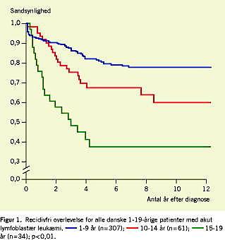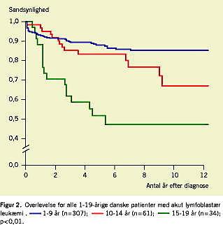 Ved sammenligning med denne gruppe blev det fundet, at den recidivfri overlevelse var signifikant højere hos de 15-18-årige, der var behandlet med børne-ALL-protokoller, end hos unge danske, der var behandlet efter voksenprotokoller (0,68 vs. 0,38, p < 0,01), mens der ikke var forskel på resultaterne mellem børn på 10-14 år og unge på 15-18 år, der blev behandlet efter de samme protokoller (upublicerede data fra det nordiske ALL-register) (0,68 vs. 0,60, p = 0,7).