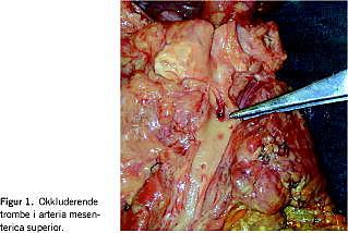 Ved en obduktion blev der fundet en okkluderende trombe i organisation i AMS (Figur 1 ) og udtalt arteriosklerose af aorta abdominalis, mest udtalt ved afgangen af mesenterialkarrene. Der var normale forhold af AMI. En histologisk undersøgelse af operationspræparater viste svære akutte iskæmiske forandringer. Der blev senere afholdt audit med gennemgang af patientforløbet og samtlige patologipræparater, hvor Crohn-diagnosen kunne bekræftes, og der var intet, der patoanatomisk pegede i retning af tarmiskæmi forud for den sidste indlæggelse.