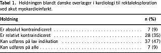 Som hos alle andre patienter ville det være naturligt at gøre det i forbindelse med indlæggelsen, hvor man har tradition for at screene for andre betydende sygdomme, og man endnu ikke har påbegyndt antikoagulansbehandling. Der var en betydelig del af de adspurgte kardiologiske overlæger (44%), der mente, at det ikke er uproblematisk at udføre rektaleksploration på AMI-patienter. Dogmet er således relativt udbredt hos landets specialister inden for behandling og undersøgelse af hjertesygdom. Når specialisterne er forbeholdne over for undersøgelsen, må man forvente, at incidensen af rektaleksploration på landets kardiologiske afdelinger er temmelig lav, hvilket også er i overensstemmelse med vores egen erfaring.