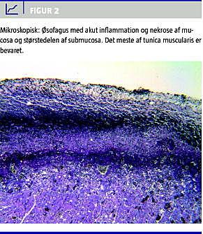 Sektion bekræftede de kliniske, radiologiske og endoskopiske fund i form af levercirrose, ascites og sortfarvning af hele øsofagus. Mikroskopisk sås i øsofagus total nekrose af mucosa og delvist af submucosa samt inflammation i den luminale del af tunica muscularis. Distalt i øsofagus var der brat overgang til intakt ventrikelslimhinde. Luminalt i øsofagus sås myriader af svampehyfer og sporer med udseende som candida (Figur 2 ). Ved sektionen fandtes i øvrigt tegn på akut pericarditis og akut tubulointerstitiel nefropati.