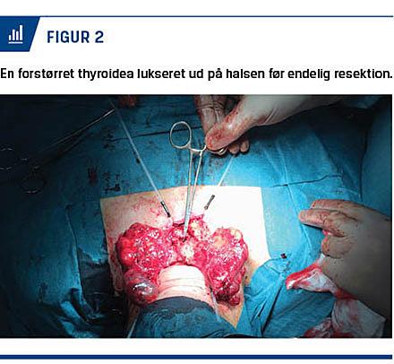 En CT af halsen afslørede en nytilkommet subglottisk stenose med en trakeal tværdiameter på kun 5 mm på niveau med den multinodøse struma og kranialt for trakealkanylen (Figur 1). En transnasal fiberskopi gav også mistanke herom. Patienten fik derfor subakut foretaget en total tyroidektomi (Figur 2). Trakealkanylen kunne ti dage postoperativt seponeres uproblematisk, og ved kontrolfiberskopi kunne man ikke længere se forsnævringen.