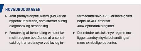I flere internationale studier – heraf ét med dansk deltagelse – har man i det seneste årti afprøvet behandling med arsentrioxid (ATO) + ATRA i sammenligning med ATRA + kemoterapi. Resultaterne viser, at der var sammenlignelige rater af komplet remission (100% vs. 95%) og sammenlignelige rater af overlevelse efter to år (99% vs. 91%) [22, 23]. I samme studie fandt man desuden mindre knoglemarvstoksicitet (mindre trombocytopeni og neutropeni) hos patienterne i ATO + ATRA-gruppen end hos patienterne i ATRA + kemoterapi-gruppen. Dog blev der hos førstnævnte hyppigere set levertoksicitet og forlænget QTc ved EKG.
