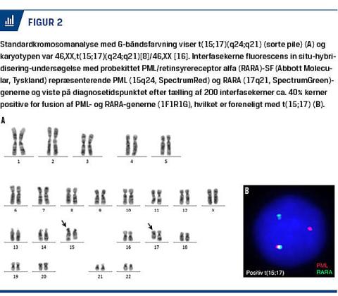 af APL med t(11;17)(q23;q12)/PLFZ-RARA, t(11;17)(q13;q12)/NuMA-RARA og t(5;17)((q35;q12)/NPM-RARA [15]. Da kromosommorfologien ved APL kan være mindre god, kan RARA-involverende translokationer være vanskelige at identificere ved standardkromosomundersøgelse, hvorfor FISH-undersøgelse er indiceret (Figur 2). FISH-undersøgelsen giver hurtig diagnostik, og et svar kan foreligge inden for fem timer.
