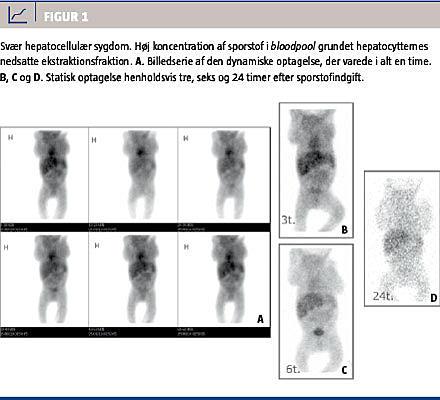En få timer gammel, fuldbåren pige blev overflyttet fra et lokalsygehus til Rigshospitalets neonatalafdeling pga. metabolisk acidose af ukendt årsag. Barnet havde respirationsinsufficiens og var slapt. Efter overflytningen blev der observeret oliguri med porterfarvet urin samt blødning fra slimhinder og indstikssteder. Blodprøverne viste svær akut leversvigt (international normalized ratio 2,6 og alaninaminotransferasekoncentration 1.080 U/l), og der initieredes behandling af dette. En akut ultralydskanning af abdomen viste upåfaldende leveroverflade og ingen dilatation af intra- eller ekstrahepatiske galdeveje, men en 3 cm stor venstresidig binyreproces. Patienten blev tiltagende ikterisk og fik påvist en koncentration af isoleret konjugeret hyperbilirubinæmi på 294 mikromol/l. Udredning for viral og autoimmun hepatitis, alfa-1-antitrypsinmangel og screening for metaboliske sygdomme gav negativt resultat. En ny ultralydskanning af abdomen viste bl.a. et ekkorigt fortættet væv langs v. porta, som det kan ses ved EG, hvorfor patienten 11 dage postnatalt blev henvist til galdevejsskintigrafi. Patienten blev forud for undersøgelsen behandlet med phenobarbital og ursodeoxykolsyre. Der blev udført dynamisk skintigrafi i en time, suppleret med statisk optagelse tre, seks og 24 timer efter sporstofindgift. Konklusionen på galdevejsskintigrafien var svær hepatocellulær sygdom og manglende udskillelse til tarmen (Figur 1). Patienten blev sat i fast ursodeoxykolsyrebehandling. Da den svære hepatocellulære sygdom kunne være årsag til den manglende udskillelse, fik patienten 21 dage postnatalt og i generel anæstesi udført magnetisk resonans-skanning af abdomen inkl. magnetisk resonans-kolangiopankreatografi (MRCP) samt lever- og binyrebiopsi i stedet for peroperativ kolangiografi. Ved de billeddiagnostiske undersøgelser påviste man normalt kalibrerede intra- og ekstrahepatiske galdeveje, en 2 cm bred bræmme af fedtinfiltration i leverperiferien, som kunne skyldes en asfyktisk skade, samt en velafgrænset 3 cm stor venstresidig binyretumor. Leverbiopsien viste svær kolestase, grad III-fibrose og let neonatal hepatitis. Binyrebiopsien viste et neuroblastom med normal N-myc, 1p og 17q og derfor med god prognose, hvorfor man valgte at observere det. Urin- vanillinmandelat- og homovanillatudskillelsen var knap forhøjet. Leverpåvirkningen og den forbigående mekaniske obstruktion af galdevejene blev tolket som værende opstået pga. tryk fra binyretumoren evt. i kombination med asfyktisk skade medførende kolestase og hepatocellulær skade. Syv uger efter indlæggelsen var der normal leverbiokemi, hvorfor ursodeoxykolsyrebehandlingen blev seponeret. Otte måneder efter indlæggelsen var neuroblastomet komplet remitteret.