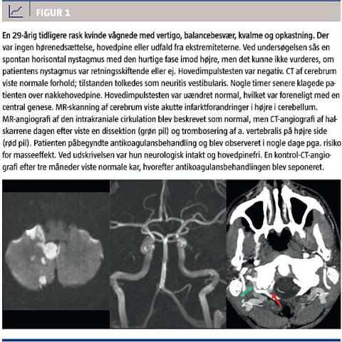 En patient, der har akut vertigo på grund af en hjernestammelæsion, har næsten altid symptomer på andre neurologiske udfald. Derimod kan det være svært at skelne mellem perifer vertigo og en vertigo sekundær til f.eks. et isoleret cerebellar infarkt. Differentieringen er dog yderst vigtig for at forbygge en ny iskæmisk episode, et cerebellart ødem med masseeffekt eller en fatal hjernestammeinfarcering sekundær til en basilaristrombose. Hyperakut indsættende eller fluktuerende vertigo ledsaget af occipital hovedpine og/eller neurologiske deficit er faresignaler i forhold til central genese, specielt hos ældre patienter med kardiovaskulære risikofaktorer og yngre patienter med nakkesmerter. Ved monosymptomatisk vertigo er det afgørende med en grundig vurdering af de okkulomotoriske funktioner. En enkel tretrinstest bestående af hovedimpulstest, observation for retningsskiftende nystagmus og skew deviation har en højere sensitivitet end MR-skanning af cerebrum med diffusionsvægtede sekvenser inden for 24-48 timer efter symptomdebut [4]. Dette understreger vigtigheden af at kunne mestre denne relativt simple kliniske undersøgelse.