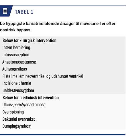 Laparoskopisk gastrisk bypass (LGBY)-operation er sammen med laparoskopisk gastric sleeve de to foretrukne bariatriske indgreb i Danmark. Antallet af LGBY-indgreb har været hastigt faldende; i 2010, blev der foretaget mere end 4.000 indgreb. I 2015 blev der foretaget færre end 500 [1]. I akutmodtagelsen ses tidligere LGBY-opererede patienter dog fortsat ofte. De differentialdiagnostiske overvejelser hos denne gruppe patienter adskiller sig fra overvejelserne hos andre patienter pga. en række specifikke senkomplikationer, der kan forekomme mange år efter indgrebet (Tabel 1). Den akutte udredning består især af diagnosticering af intern herniering, ulcussygdom og galdesten, men generelle abdominalkirurgiske senkomplikationer som mekanisk tyndtarmsileus og incisionelle hernier skal også overvejes, omend de er sjældent forekommende [2].