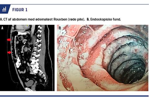 En 55-årig mand var tidligere blevet opereret med LGBY. Der var ingen komorbiditet, og det postoperative forløb havde hidtil været ukompliceret. Han blev indlagt med akut indsættende mavesmerter, der var begyndt 18 timer forinden. Han var akut smertepåvirket med svær diffus ømhed abdominalt uden peritonealia. Han var hæmodynamisk upåvirket med stabil respiration og subfebril 38,4 °C. Biokemisk fandt man flg. værdier: leukocytter 20,2 mia./l og C-reaktivt protein 135 nmol/l og ellers normale værdier af blodprøver – inklusive normal arteriellaktat. På mistanke om intern herniering blev der foretaget CT (Figur 1A) af abdomen med peroral og intravenøs kontrast. Denne viste et ødematøst fortykket Rouxben fra anastomosen til restventriklen og ca. 50 cm i anal retning. Den distale øsofagus og restventrikel var billeddiagnostisk upåfaldende. Der var ingen tegn til intern herniering eller ileus. Pga. den klare anatomiske overgang fra en upåfaldende øsofagus og restventrikel til ødematøst fortykket jejunum havde man primært mistanke om en vaskulær årsag. Den akutte opståen gav mistanke om akut embolus. Der blev foretaget diagnostisk laparoskopi, som viste normale forhold, inklusive et upåfaldende Rouxben. Operationen blev derfor efterfulgt af øvre endoskopi, som viste en upåfaldende øsofagus og restventrikel, mens der i Rouxbenet, umiddelbart efter anastomosen, blev fundet ødematøst fortykket, men vitalt mucosa med udbredte, ikke fastsiddende, hvidlige belægninger (Figur 1B). Undersøgelserne var diagnostisk inkonklusive. Dagen efter oplyste patienten, at han kunne relatere smerterne til et accidentielt indtag af et enkelt glas 80% spiritus (8-10 cl) 1-2 timer før, de opstod. Han havde ikke et tidligere kendt stort alkoholforbrug. Han blev observeret yderligere et døgn for sine symptomer og blev herefter udskrevet i fuldstændig smerteremission. En gastroskopi en måned efter indlæggelse viste helt normale forhold.