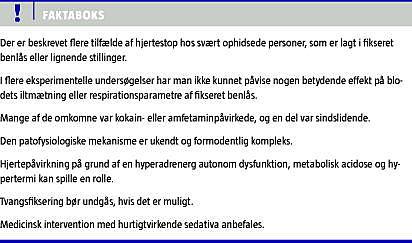 Summary Sudden deaths by hobble restraint of severely hyperactive persons Ugeskr Læger 2012;174(40):2369-2372 Cardiac arrest may occur while persons are being kept in hobble restraint. It has been suggested that asphyxia caused by the restraint position, so-called restraint asphyxia, is the cause, but experimental evidence has not confirmed this theory. Some of the sudden deaths are associated with excited delirium syndrome (EDS), an acute condition characterized by a hyperactive, combative behaviour in individuals, who are influenced by psychoactive drugs or suffer from psychiatric illness. Autopsy findings fail to explain this type of deaths. The pathophysiology of EDS is complex and poorly understood. Sensibilisation of the heart by a hyperadrenergic autonomous dysfunction, metabolic acidosis and hyperthermia offer possible mechanisms.