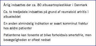 Albueartroplastik er imidlertid en krævende procedure, indikationsområdet er ret begrænset og antallet af komplikationer er fortsat betydeligt, hvorfor det anbefales, at disse operationer centraliseres på forholdsvis få afdelinger [33].