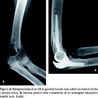 Langt den hyppigste indikation for indsættelse af albueartroplastik er destruktion af leddet pga. reumatoid artritis, idet en betydelig del af patienterne med reumatoid artritis kan forventes at få invaliderende smerter i albuen [5]. Traditionelt har man foretaget interpositionsartroplastik eller synovektomi og resektion af caput radii hos disse patienter, men total albueartroplastik har nu i vid udstrækning erstattet dette indgreb (Figur 1 ) [6]. Også hos yngre patienter med juvenil reumatoid artritis kan der i visse tilfælde være indikation for indsættelse af en total albueartroplastik [8].