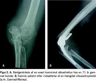Ved komminutte brud i den distale humerus kan der være indikation for total albueartroplastik, især hos ældre osteoporotiske patienter med intraartikulære brud, hos hvem reposition og osteosyntese ikke er mulig (Figur 2 ) [8-11] og ligeledes kan smerter og bevægeindskrænkning efter sådanne brud være indikation for total albueartroplastik [12]. Der findes et beskedent indikationsområde for total albueartroplastik hos patienter med udtalt instabilitet [13, 14] eller udtalt stivhed af albuen [15] og hos patienter med albuedestruktion pga. hæmofili [16]. Endelig er primær artrose i albuen en sjælden indikation for albueartroplastik [17, 18].
