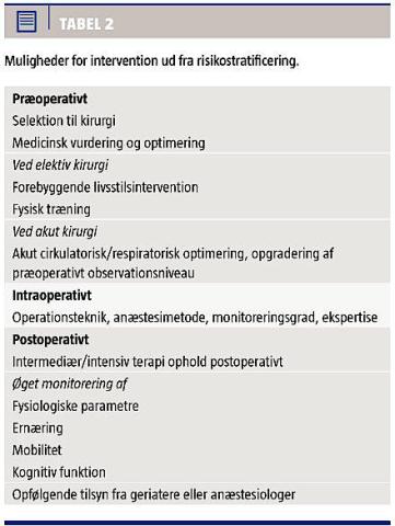 risiko for død, bør der kun afstås fra at operere de patienter, hvor operationen ligeledes giver en næsten 100% risiko for død eller varigt uacceptabelt funktionstab. Alder i sig selv er ikke en specifik prædiktor for dette. Ved hoftefrakturkirurgi er det præfrakture funktionelle niveau og komorbiditeten (American Society of Anesthesiologists (ASA)-score) fundet at have højere korrelation med postoperativ mortalitet end høj alder. Tilstedeværelsen af demens eller bopæl på plejehjem var lige så betydende som høj alder [19]. Ved akut abdominal kirurgi har risikostratificering i vid udstrækning været baseret på scoringssystemer, hvor alder indgik sammen med akutte fysiologiske parametre [21].
