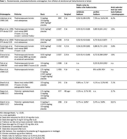 I en række placebokontrollerede, dobbeltblinde, randomiserede undersøgelser har man undersøgt effekten af alendronat som sekundær og tertiær profylakse mod postmenopausal osteoporose med frakturer som effektmål. Som det fremgår af Tabel 1 , reducerer alendronat 10 mg/dag incidensen af vertebrale frakturer ved postmenopausal osteoporose med ca. 48% i forhold til placebo. I to studier reducerede alendronat desuden signifikant forekomsten af frakturer i det perifere skelet (Tabel 1 ).