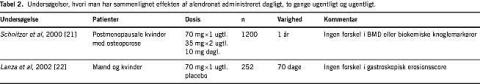 Effekten af alendronat 70 mg en gang om ugen er undersøgt i to publicerede studier (Tabel 2 ). I et dobbeltblindt design sammenlignede Schnitzer et al [21] effekten af alendronat 70 mg en gang om ugen, 35 mg to gange om ugen og 10 mg dagligt hos 1.200 postmenopausale kvinder med osteoporose (T-score < 2,5 eller tidligere hofte- eller vertebralfraktur). Studiet var dimensioneret således, at der var 90%'s sikkerhed for at påvise forskelle på 1,5% i BMD i columna lumbalis mellem behandlingerne. Der var ingen signifikant forskel mellem de tre grupper mht. BMD målt ved DEXA-skanning i columna lumbalis, collum femoris, trochanterregionen og den proksimale femur (Fig. 1 ) [21]. Alendronat 70 mg en gang og 35 mg to gange om ugen havde endvidere samme effekt som alendronat 10 mg/dag på urin-NTX-kreatininratio og S-knoglespecifik alkalisk fosfatase, som i en række andre studier er vist at afspejle knogleresorption og -formation (Fig. 2 ) [21]. Der foreligger ingen undersøgelser af effekten af alendronat 70 mg/dag på frakturforekomsten, men ændringer i BMD under alendronatbehandling er relateret til effekten på frakturforekomsten [23]. Da virkningsmekanismen desuden er kendt og formentlig identisk ved de to administrationsformer, synes det at være rimeligt at ekstrapolere fra ovennævnte studier og antage, at alendronat 70 mg en gang om ugen og 10 mg dagligt har samme effekt på frakturforekomsten. Alendronat er i Danmark kun indregistreret til behandling af postmenopausal osteoporose, men en række data dokumenterer anvendelsen ved glukokortikoidinduceret osteoporose og hos mænd med osteoporose (se ovenfor). Der foreligger imidlertid ikke data vedrørende effekten af 70 mg en gang om ugen på disse indikationer.