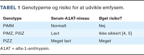 A1AD er et eksempel på, at arvelige faktorer og miljøpåvirkning interagerer, og i fællesskab har betydning for sygdomsmanifestation. Rygere med genotypen PiZZ har en meget høj risiko for at udvikle emfysem og får som oftest symptomer herpå allerede i 30-40-årsalderen [3] (Tabel 1). I det danske A1AD-register har man fundet, at medianoverlevelsen for rygere er 49 år, mens aldrigrygeres overlevelse ikke er signifikant forskellig fra overlevelsen i den øvrige danske befolkning [3]. Rygere med en af de to heterozygote former, PiSZ og PiMZ, har ikke sikkert øget risiko for udvikling af emfysem, og nyere undersøgelser viser, at mere manifest udvikling af emfysem kræver samtidig tilstedeværelse af andre genetiske faktorer [6, 7].