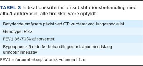 A1AD bør særligt overvejes hos patienter, der har symptomgivende KOL og/eller emfysem og samtidig er under 50 år og/eller har sparsom rygehistorik (uagtet alder). Øvrige forhold, som kan give mistanke om A1AD, er oplistet i Tabel 2 [14]. Ved begrundet mistanke anbefales det at foretage gentest inden henvisning til lungemedicinsk regi, da det vil kunne accelerere udredningsforløbet. På et specialiseret afsnit omfatter udredningen genotypebestemmelse, hvis den ikke foreligger fra primærsektoren, måling af antitrypsinkoncentration, væske- infektions- og levertal, hæmatologi og hepatitisprøver, udvidet lungefunktion, urincotininniveau (afslører rygning), arterieblodgasniveau og CT af lungerne mhp. vurdering af emfysem.