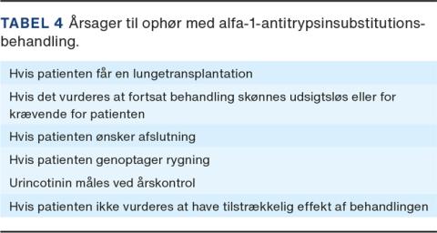 Selvom A1AD fænotypisk adskiller sig fra almindelig tobaksinduceret KOL, er behandlingen for alle praktiske formål den samme. Da A1AD forekommer sjældent, er der ikke foretaget kontrollerede studier af den gængse KOL-behandling inklusive inhalationsbehandling hos denne patientgruppe [16]. Patienterne bør gennemgå lungerehabilitering for at optimere deres fysiske formåen.
