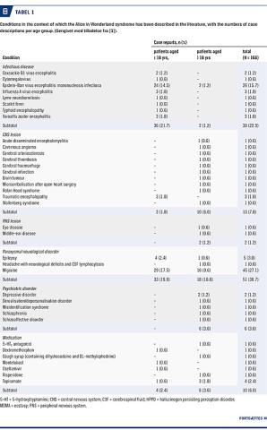 Syndromet er, som det mest karakteristiske, kendetegnet ved bizarre forvrængninger af eget kropsbillede, metamorfopsi, mikropsi og makropsi. Derudover kan patienten opleve bizarre perceptuelle forvrængninger af bevægelse (herunder ændret tidsopfattelse) og farve samt auditive hallucinationer. Ved søgning i PubMed på The Alice In Wonderland syndrome fremkom der 123 hit. Ved bredere søgning på termen Alice In Wonderland fremkom en del dubletter samt publikationer uden relevans. Ved gennemgang af søgningerne blev i alt 148 artikler fundet relevante. Heraf var langt de fleste kasuistikker. Årsagerne til syndromet synes at variere med patientens alder, hvor den hyppigste hos børn var encefalitis og hos voksne migræne. I et review af Blom nævnes i en oversigt samtlige årsager, der er identificeret i litteraturen [3] (Tabel 1).