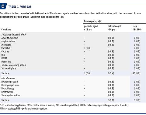 AIWS er et eksempel på en potentielt somatisk og behandlingskrævende tilstand, der er i risiko for at blive overset hos børn i psykiatrien. Omvendt vides den også at forekomme ved en række psykiatriske lidelser som depression og skizofreni [1]. Diagnosen findes ikke i ICD-10 eller DSM-5, men stilles ud fra det karakteristiske symptombillede og forekommer ved en række tilstande som f.eks. epilepsi, migræne og visse infektiøse sygdomme samt i sjældne tilfælde som manifestation af en cerebral tumor. Der er få beskrevne tilfælde af AIWS i litteraturen, men samtidig findes der studier, der tyder på, at især de mest almindelige symptomer ved AIWS (mikropsi/makropsi), forekommer langt hyppigere end umiddelbart beskrevet [5]. Det er foreslået, at der skal oprettes en database, der kan danne grundlag for større epidemiologiske undersøgelser af fænomenet. Da der ikke er nogen kendt patofysiologi, som kan forklare alle tilfælde, skal udredning og behandling tilrettelægges efter formodet årsag [3]. Tilstanden har dermed klinisk relevans som et eksempel på et symptombillede, der befinder sig i grænsefladen mellem somatik og psykiatri.