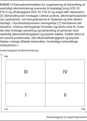 Behandlingen kan organiseres som enkeltfokus, sekventielt, parallelt eller integreret [16]. Ved enkeltfokus behandles patienten enten for skadeligt brug/afhængighed eller for angst eller depression under antagelse af, at behandlingen af en tilstand vil bedre den anden. Ved sekventiel behandling fokuseres først på den ene tilstand og herefter på den anden, ved parallel behandling behandles begge samtidig, men af forskellige behandlere eller team fra forskellige sektorer, og ved integreret behandling foretages behandlingen også samtidig, men af samme behandler(team) inden for en organisatorisk ramme. En gennemgang af 24 guidelines for behandling af samtidig depression/angst og skadeligt brug/afhængighed viste, at enkeltfokusbehandling synes at være obsolet [17], og integreret behandling har formentlig bedst effekt. Firekvadrantmodellen (Figur 1) er foreslået som overordnet ramme for organiseringen af behandlingsindsatsen [18]. Med stigende sværhedsgrad (I-IV i figuren) kræves stigende integration af behandlingen, inklusive den organisatoriske ramme for behandlingen. Modellen indgår dog sjældent i guidelines og spiller ingen rolle i de to guidelines, som nævner modellen [17]. Ingen guidelines adresserer vigtige forhold som »matching« af behandlingsbehov eller evaluering af sværhedsgraden af tilstandene. Specielt for Danmark kan fremføres, at behandlingen er opdelt med skadeligt brug/afhængighed, der behandles i almen praksis i kommunalt regi, og de psykiatriske sygdomme, der ofte behandles i regionalt regi, i hvert fald med stigende sværhedsgrad.