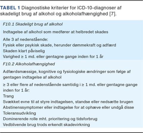 Angst, depression og skadeligt brug/afhængighed af alkohol er hyppigt forekommende lidelser, både hver for sig og samtidig til stede hos samme person. Symptomer som uro, rastløshed, tristhed, nedsat energi, manglende lyst m.fl. kan ses ved alle tre lidelser. I denne artikel defineres skadeligt brug af alkohol/alkoholafhængig ud fra ICD-10, hhv. diagnoserne F10.1 og F10.2 (Tabel 1). Angst (F41.x) og depression (F32.x og F33.x) er ligeledes defineret ud fra ICD-10 [1]. Ofte vil det være svært at få afklaret, om symptomerne er til stede som led i en angst- eller depressionssygdom eller er en følge af skadeligt brug/afhængighed af alkohol. Modsat kan angst og depression føre til skadeligt brug/afhængighed af alkohol. Kombinationen af skadeligt brug/afhængighed af alkohol og en af de to psykiske sygdomme medfører en dårligere prognose, et øget forbrug af sundhedsvæsenet og en overdødelighed [2].
